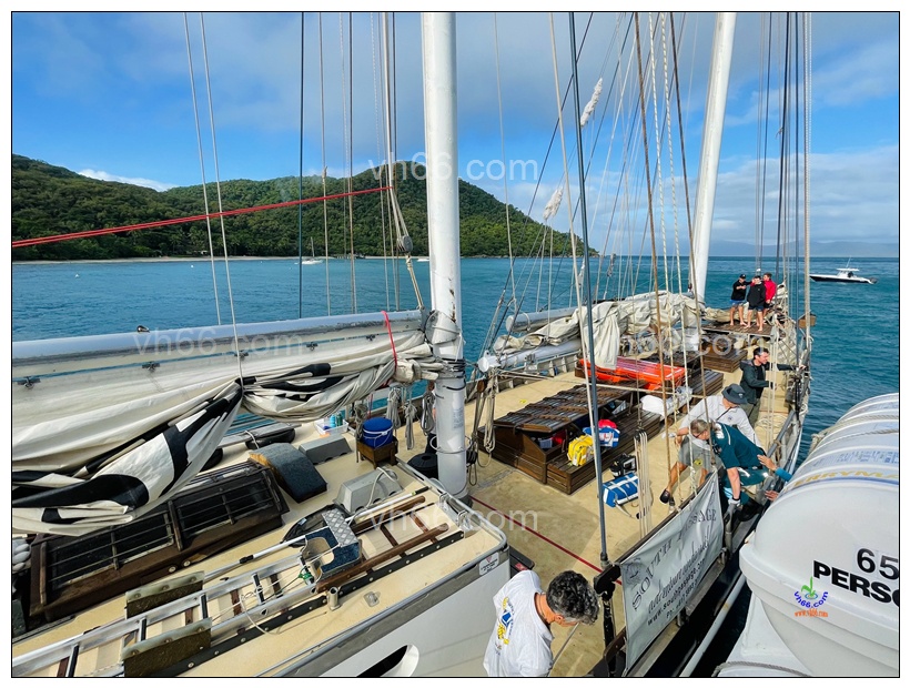 Ambulance officers transferred to a training yacht at sea.